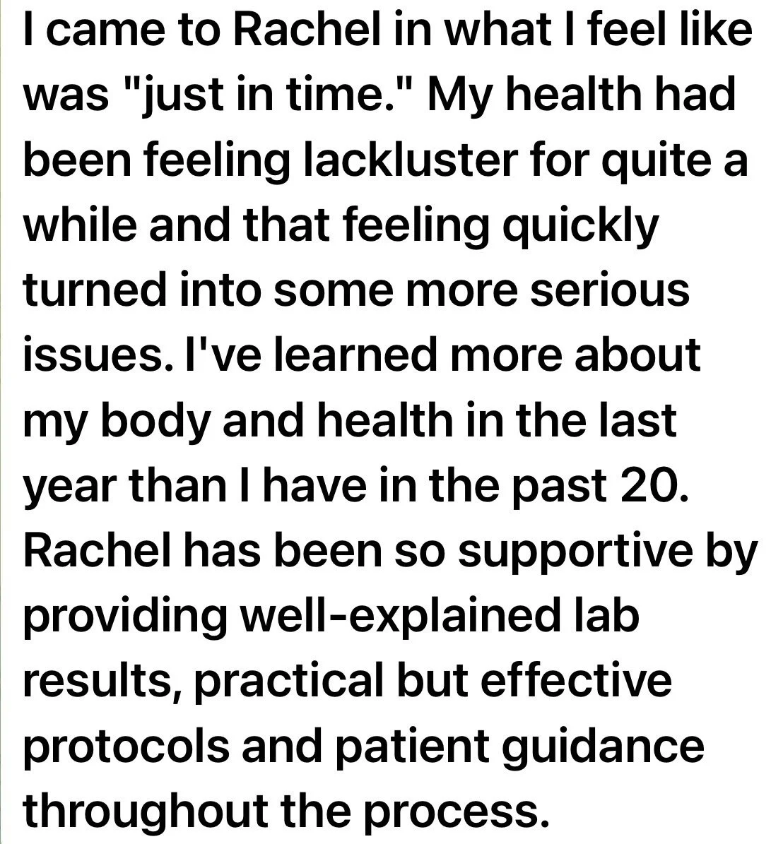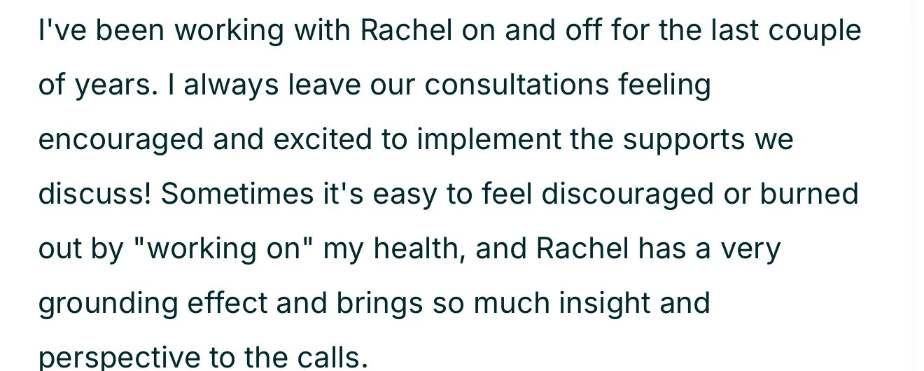 “Rachel is able to use her knowledge and the resources available for a great mix of supplemental and scientific aids in combination with lifestyle changes that support mental health and clarity as well.”